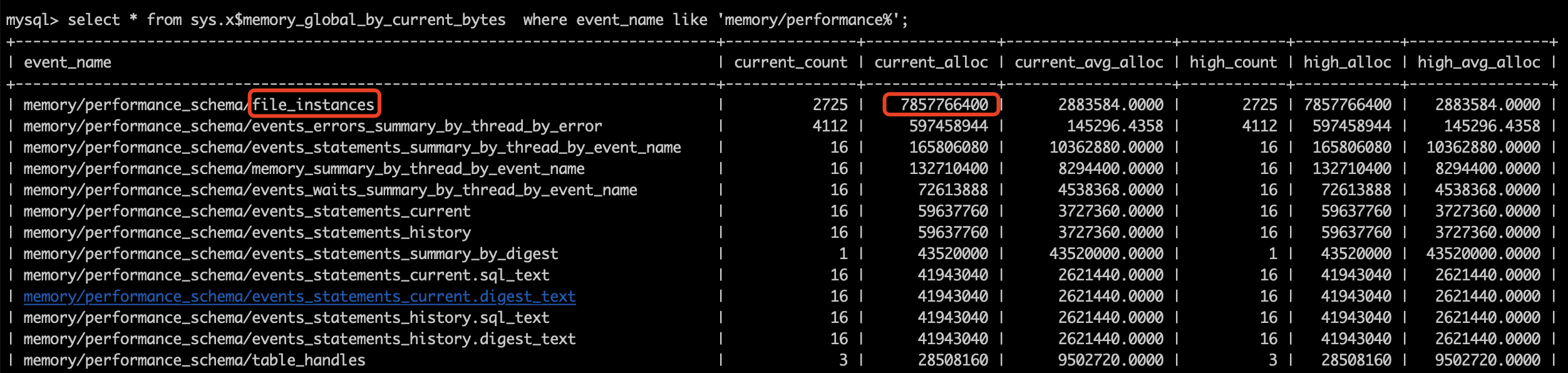 我们发现 performance_schema 大约占用了 7.3 个 G! 这么大的内存占用, 那我们只要关闭 performance_schema 这个功能, 内存就降下去了, 对我们也没有什么影响.